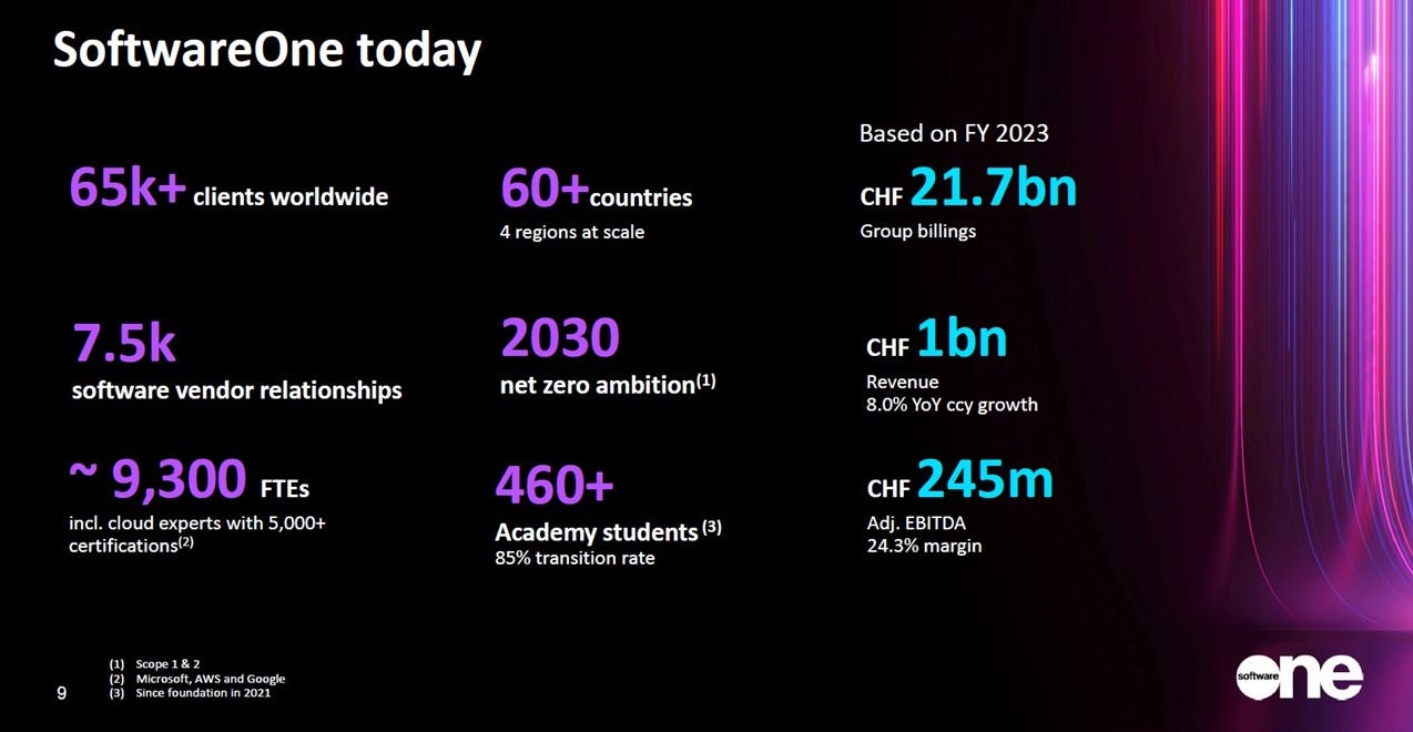 SoftwareONE provides comprehensive software management services to 65k+ business customers across 60+ countries through two divisions: Software & Cloud Marketplace (“S&CM”, ~55% of net revenues in 2023) and Solutions & Cloud Services (“S&CS”, ~45%). Revenues are skewed heavily to EMEA (62% of total), with the rest in US/Canada (14%), Asia-Pacific (14%) and Latin America (9%). The business is 100% software and 0% hardware.